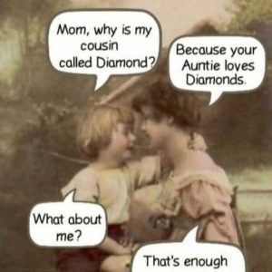 Son: Mom why is my cousin named Diamond? Mom: Cause your aunt loves diamonds. Son: What about me !? Mom: Enough questions Dicky …….. ! Smart people…