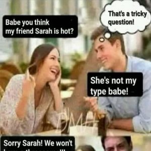 Babe you think my friend Sarah is hot? That’s a tricky question! She’s not my type babe! Sorry Sarah! We wont have a threesome!!!