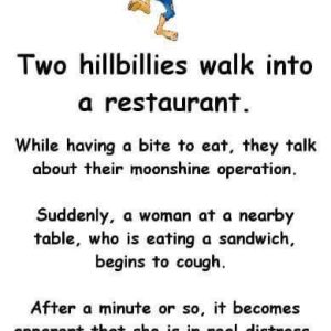 While having a bite to eat, they talk about their moonshine operation. Suddenly, a woman at a nearby table, who is eating a sandwich, begins to cough….