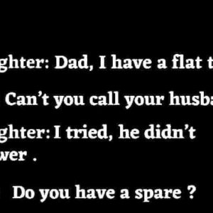 Daughter: Dad, I have a flat tire! Dad: Can’t you call your husband? Daughter: I tried, he didn’t answer. Dad: Do you have a spare? Daughter: He…