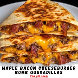 Maple Bacon Cheeseburger Bomb Quesadillas Ingredients: 4 large flour tortillas 1/2 lb ground beef 4 strips bacon, cooked and chopped 1/2 cup cheddar cheese, shredded 1/4 cup…