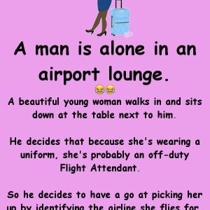 A man is alone in an airport lounge. A beautiful young woman walks in and sits down at the table next to him. He decides that because…