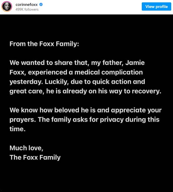 In a statement that was issued on behalf of the Foxx family, Corinne said, “We wanted to communicate that my father, Jamie Foxx, had a medical problem yesterday.”