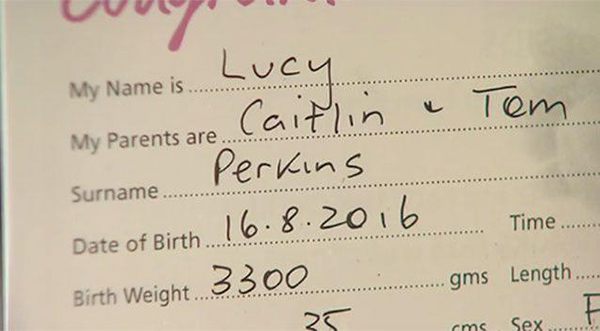Caitlin and Tom Perkins welcomed Lucy, their first child, into the world on Tuesday night.