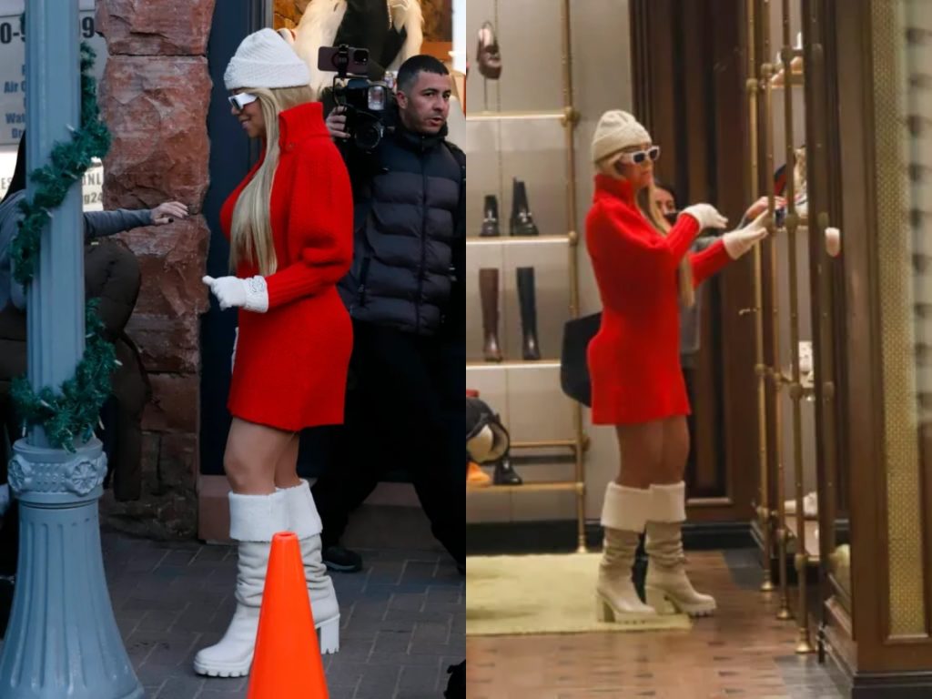 Dressed in a figure-hugging red sweater dress inspired by Mrs. Claus, she paired the look with knee-high boots, a white beanie, gloves, and oversized sunglasses, exuding chic holiday spirit. Social media buzzed over her appearance, with some critiquing her outfit and speculating about her noticeably enhanced curves.