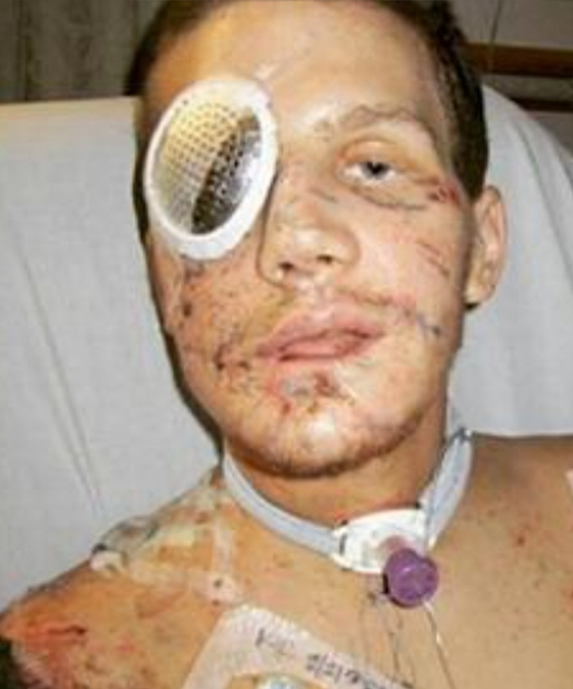 As a direct consequence of the subsequent explosion, he was left in a critical condition. His body was riddled with shrapnel, and the bones in his head and face had been crushed in the explosion. In addition, Kyle suffered from the loss of a piece of his jaw, the collapse of one of his lungs, and was given the designation of P.E.A. (patient expired on arrival) when he returned to Camp Bastion.